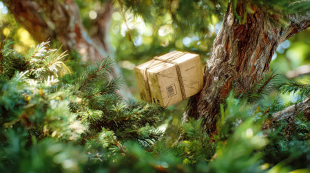 A brown cardboard delivery box is wedged in the branches of a tree in a sunny forest, humorously depicting a failed package delivery in a natural setting.
