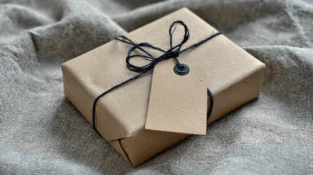 This image showcases a beautifully wrapped gift package in brown paper, secured with black twine, featuring a blank tag on soft natural fabric, perfect for any occasion.