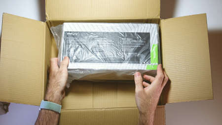 Paris, France - Feb 20, 2019: View from above POV man unboxing latest Nvidia Quadro RTX 5000 workstation professional video card GPU from the cardboard Amazon Parcel box