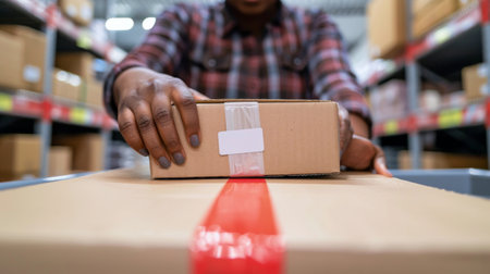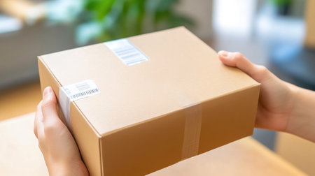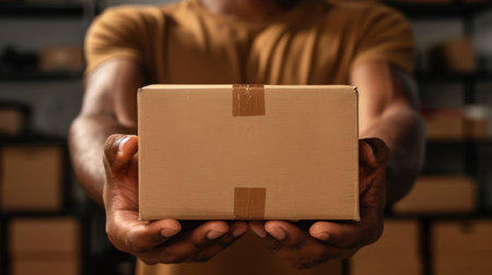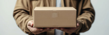 Person holds plain cardboard box in warehouse setting, showcasing importance of packaging and delivery. focus is on hands and box, emphasizing quality control and unboxing