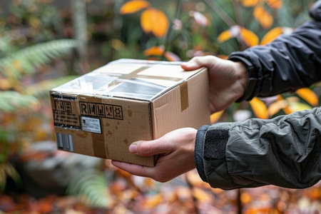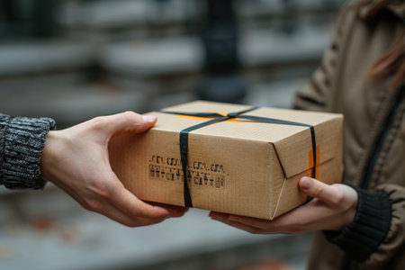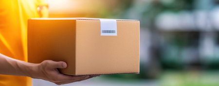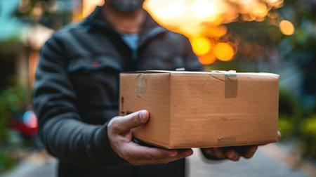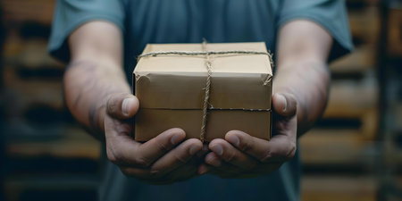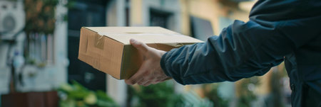 Delivery mans hands holding a parcel box symbolizing reliable service and customer satisfaction in a dynamic and efficient manner. Concept Delivery Service, Reliable, Customer Satisfaction
