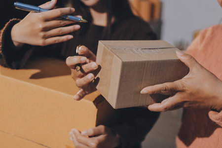 Close up of hands cargo staff are delivering cardboard boxes with parcels inside to the recipient's hand.