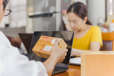 businesswoman start small business and successful SME entrepreneurs A woman works from home delivering parcels online. SME delivery concept and packaging