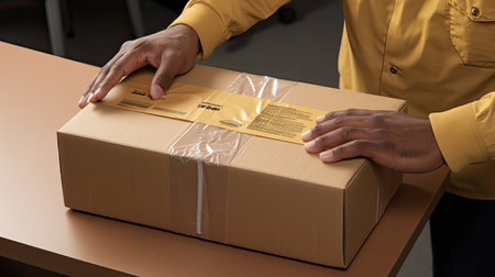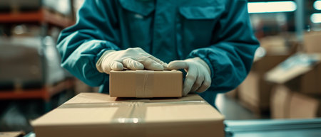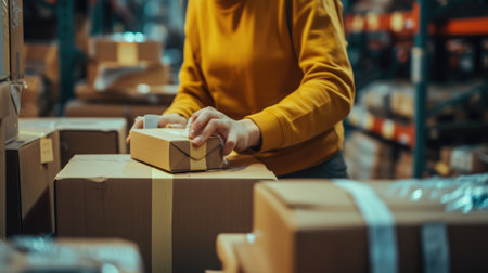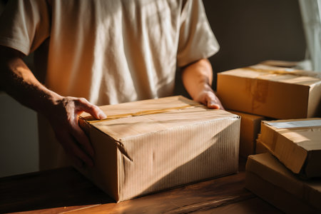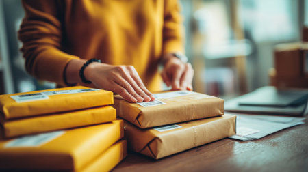 Packing and labeling packages in workspace, showcasing person carefully handling parcels. warm lighting creates cozy atmosphere, emphasizing attention to detail in shipping preparations