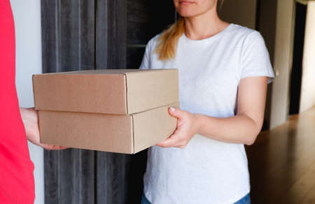 A delivery courier hands over cardboard boxes of goods to a woman near the door of her house.