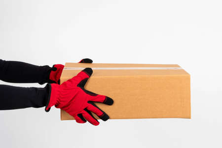Delivery service. Courier service. A man in work gloves holds a cardboard box. Delivery of parcels. The courier hands in red gloves hold a cardboard package. Home delivery of orders.