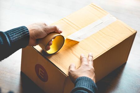 Close up male hand wrapping packaging box by tape.Business online shopping.logistic transportation service.moving home concepts