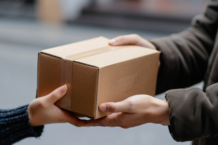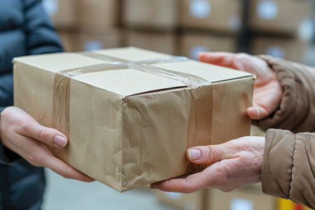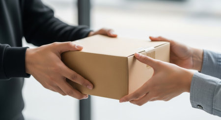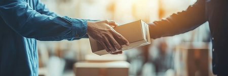 A close-up view depicts a delivery person handing a cardboard box to another individual. The scene features warm color tones and an illuminated interior space suggesting a home environment. The focus is on the package and the exchange, suitable for commercial projects about shipping and receiving.