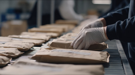 Medium shot focusing on the assembly of biodegradable mailers and ecopacked parcels illustrating innovative sustainable packaging in clean organized shipping operations.