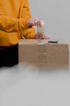 female hands paste a cardboard box closeup on a light background with tape. vertical photo