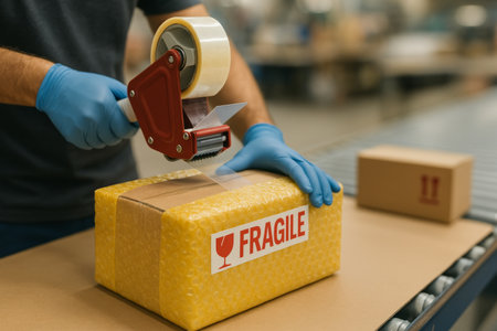 A worker is sealing a fragile package with tape in a shipping facility. The setting is organized, with boxes and packing materials nearby, ensuring secure and careful handling of items.