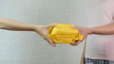 Delivery. Man courier hands over cardboard boxes to woman. Close-up on hands. White brick wall background.