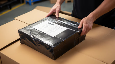 Plastic black bag covering the parcel out for protection product cracked or insurance during transit in brown carton box. Ecommerce shipment service concept