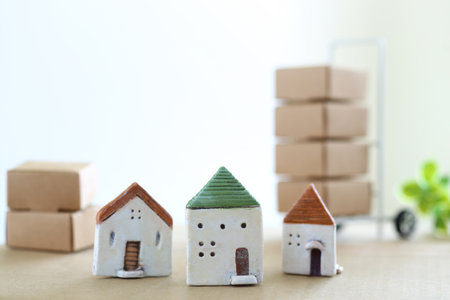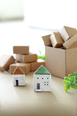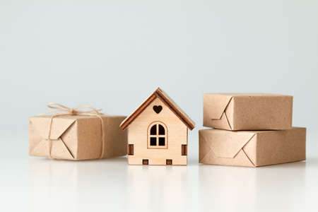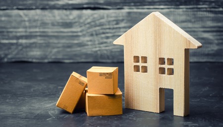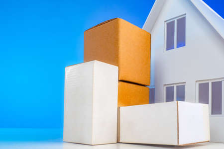 boxes with things for moving on the background of a new house. concept of moving to a new home.