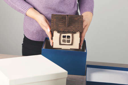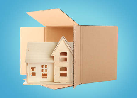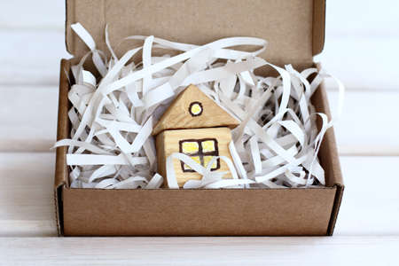 Opened box with different sizes of small wooden houses model. The concept of selling new home