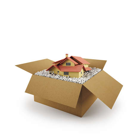 House in a cardboard box. Concept of buying a dwelling. 3D Rendering