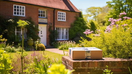 Postal service, home delivery and online shopping, parcel box on a house doorstep in the countryside, post-processed, generative ai