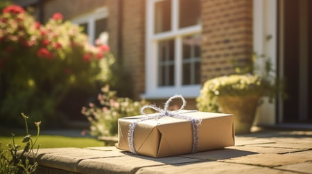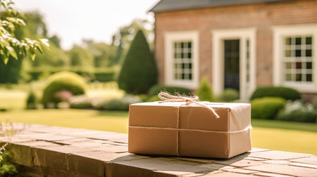 Elegant gift shop delivery, postal service and luxury online shopping, parcel box with a bow on a house doorstep in the countryside, post-processed, generative ai