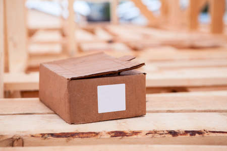 Shipping label attached to a cardboard box ready for delivery in a storage area