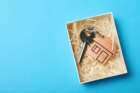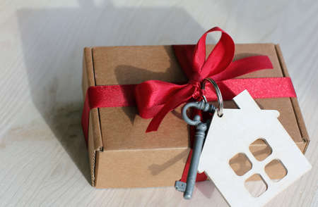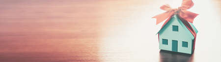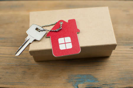 Key to the apartment with a tag with the inscription - home and the red decorative house are on a blue background. The topic of buying or purchasing an apartment.