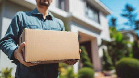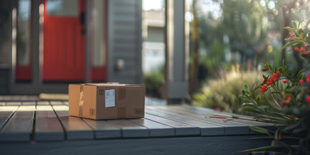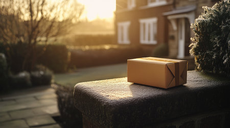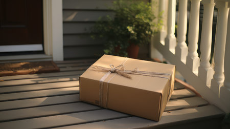 A cardboard box rests quietly at the front door of a house during a sunny afternoon. The warm light casts soft shadows, hinting at a peaceful outdoor scene.