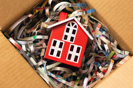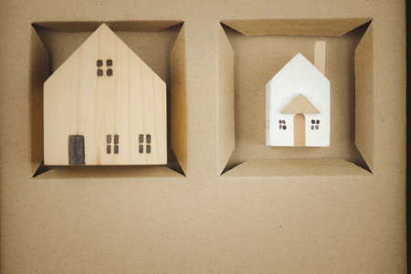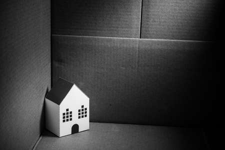 Small house and big miniature house in hole brown box. family and home concept. Property seller, buyer, agent, offering in selling, buying apartment