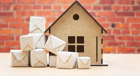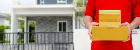 cardboard boxes near the house. The concept of moving to another house, relocation. Transportation of property and goods, home delivery. Shopping online. Housewarming. Cargo transportation