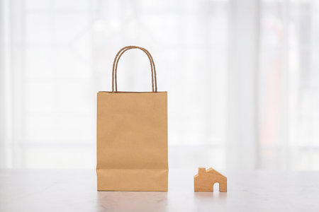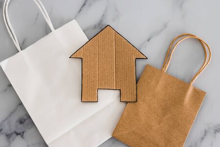 the new normal after covid-19, Contactless Delivery text on notepad with shopping bag and house icon concept of purchases during isolation and lockdown