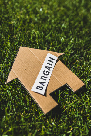 cardboard house with Bargain text on it on top of perfect green lawn, concept of real estate market and finding a dream property