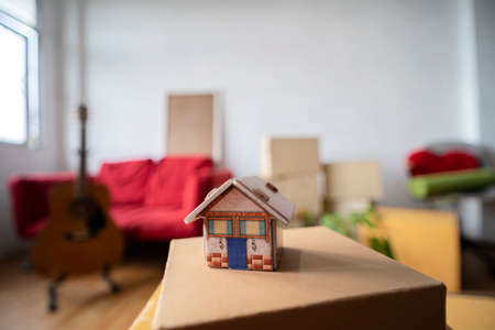 Model of the wooden house on the floor in the new bright sunny house. Moving boxes with belongings in empty room