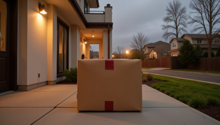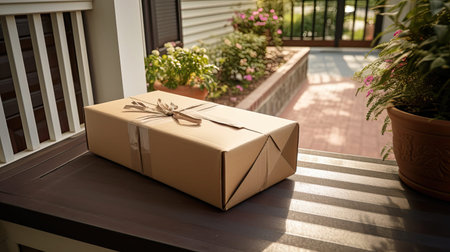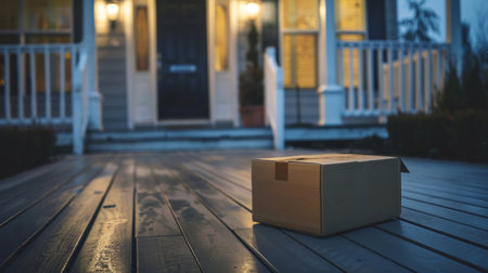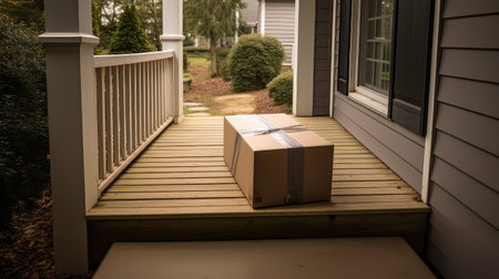 Delivery box on doorstep in foggy suburb, realism stock photo. generated by ai
