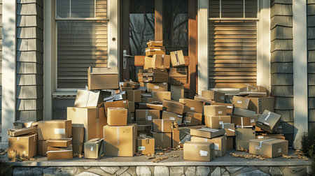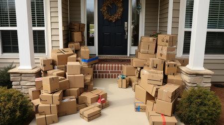 a home front porch overwhelmed by a chaotic stack of boxes, depicting the frenzy of deliveries and modern living