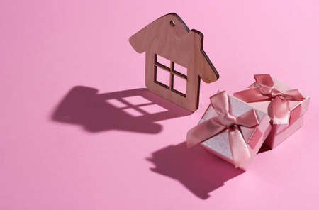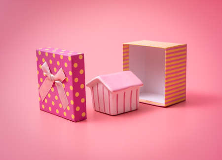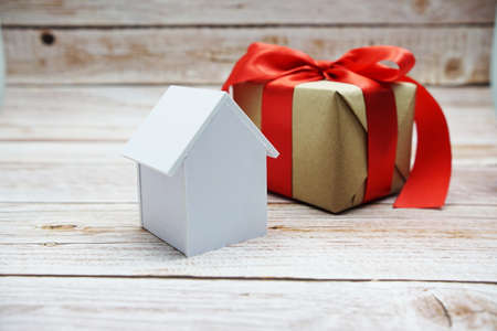 Real estate gift, home gift. White toy house in a gift box on a yellow background. Postcard for printing, banner with place for text.