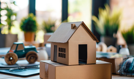 Insurance for house and car concept. Wooden house and wood car in brown box. Family home, Protection insurance. New home and new car