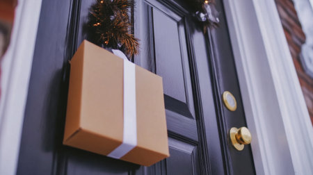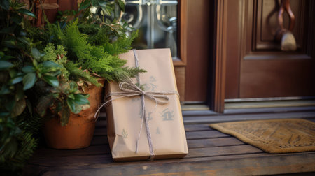 A beautiful gift box wrapped in a ribbon is placed on a doorstep, surrounded by holiday decorations, evoking a warm and festive atmosphere.