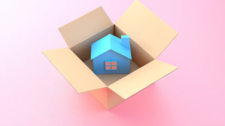 Miniature blue house is positioned within an open cardboard box against a pastel pink background. The box and house are both rendered in a simple, stylized manner, using a light, soft color palette. The image conveys a sense of possibility and the concept of home.