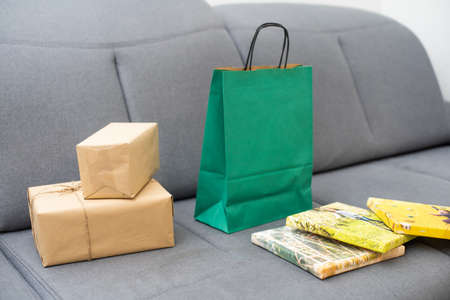 Boxes near the house. Concept - delivery of goods from online stores. Parcels at the door. Delivery to the door. Moving to a new home. Concept - transport company. Logical business. Multi-colored box