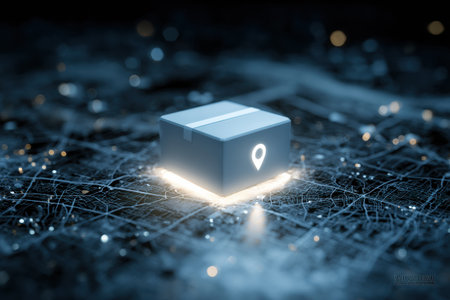 A bright package icon is suspended over a detailed map background, highlighting the importance of delivery services in modern city navigation during nighttime.