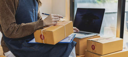 Business woman start up small business entrepreneur SME success .freelance woman working at home with Online Parcel delivery. SME and packaging deliveryconcept