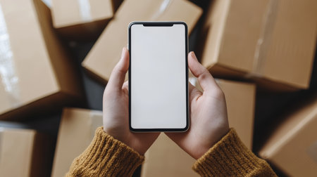 Hands Holding Smartphone With Blank Screen, Cardboard Boxes Background, Online Shopping Concept.
