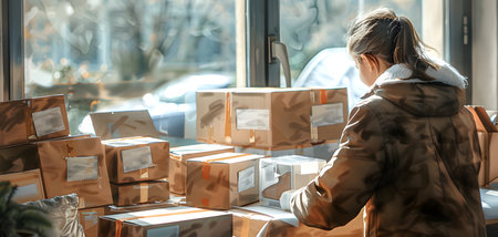 Packing and labeling packages in workspace, showcasing person carefully handling parcels. warm lighting creates cozy atmosphere, emphasizing attention to detail in shipping preparations