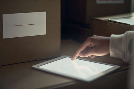 Cropped view of young delivery man preparing parcel box to customer and checking orders on tablet