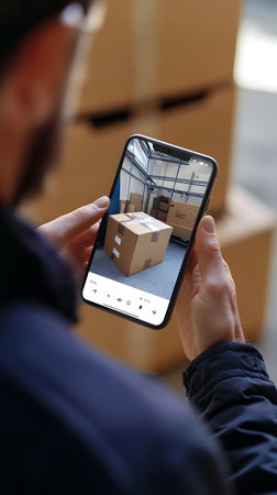 A person holds a smartphone, capturing an image of a stacked cardboard box in a warehouse environment.