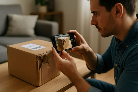 Customer documenting damaged cardboard box with mobile phone camera for complaint or insurance claim