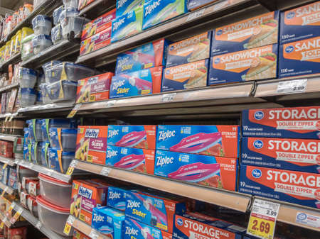 Seattle, WA / USA - circa November 2019: Angled view of Ziploc and other brands food storage containers inside a QFC grocery store.