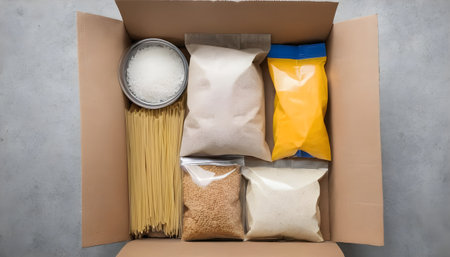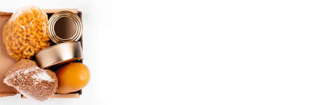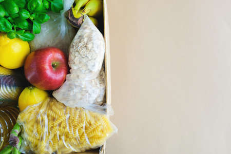 Top view of a cardboard box with products, donation of basic necessities, pasta, sunflower oil, oatmeal, fruits, herbs. Copy space