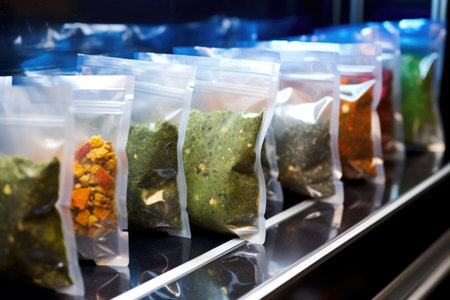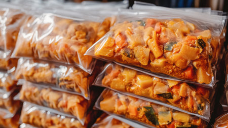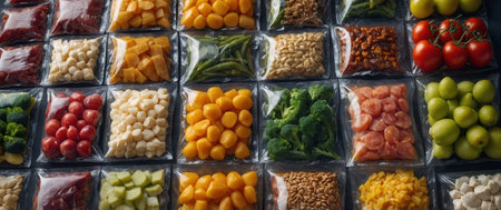 A row of plastic bags with various meats and vegetables inside. The bags are all different colors and sizes, and they are arranged in a neat row. Concept of organization and order