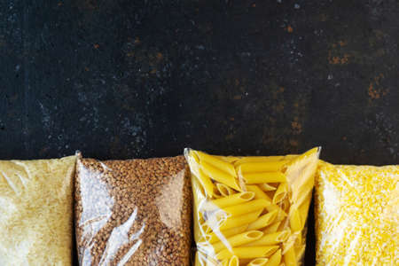 Food supply quarantine food crisis isolated on black concrete background. Rice, pasta, corn flakes, buckwheat. The concept of food delivery, donation, charity. Copyspace.