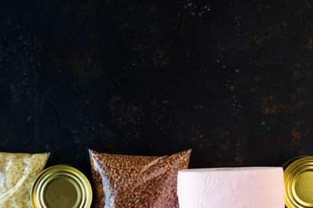 Food supply quarantine food crisis isolated on black concrete background. Rice, buckwheat, toilet paper, canned food. The concept of food delivery, donation, charity. Copyspace.