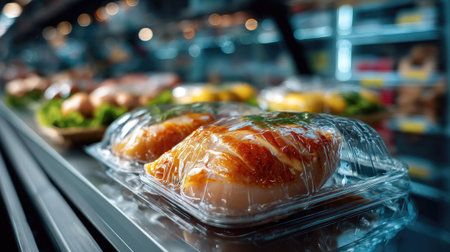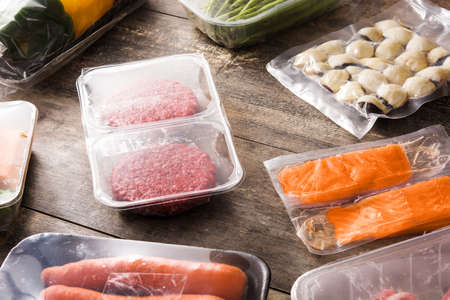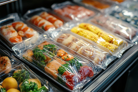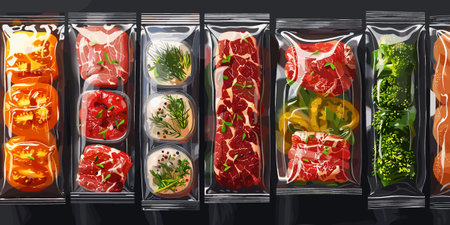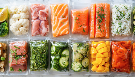 Selection of fresh fish, vegetables, and meat, vacuum packed and ready for storage